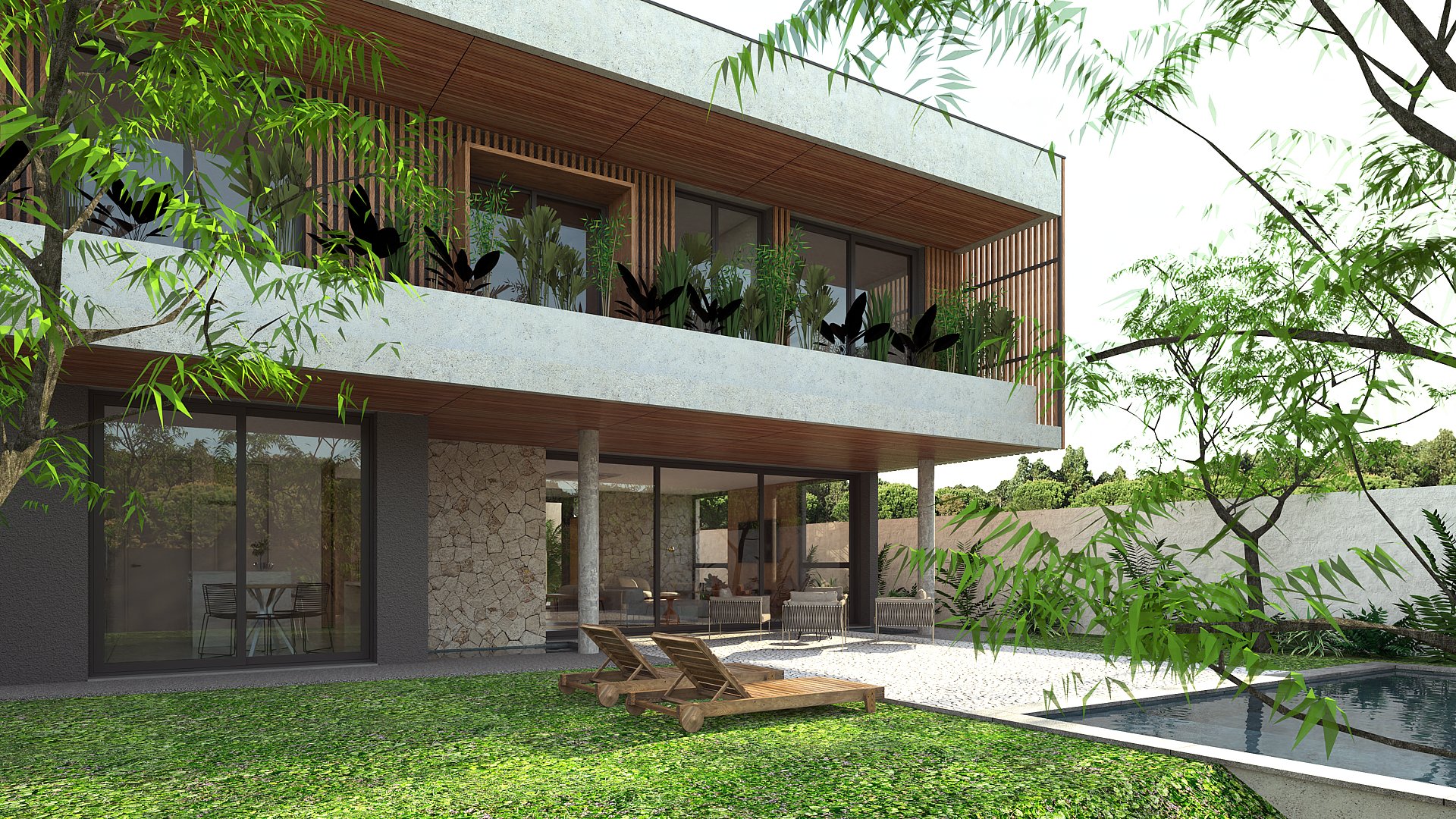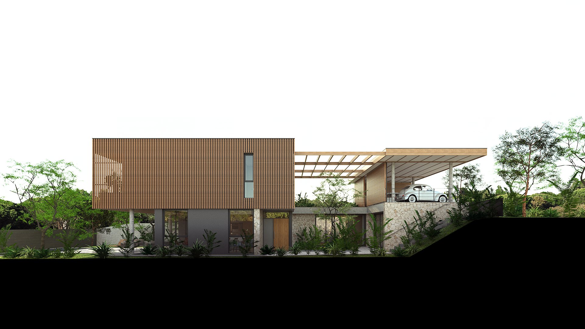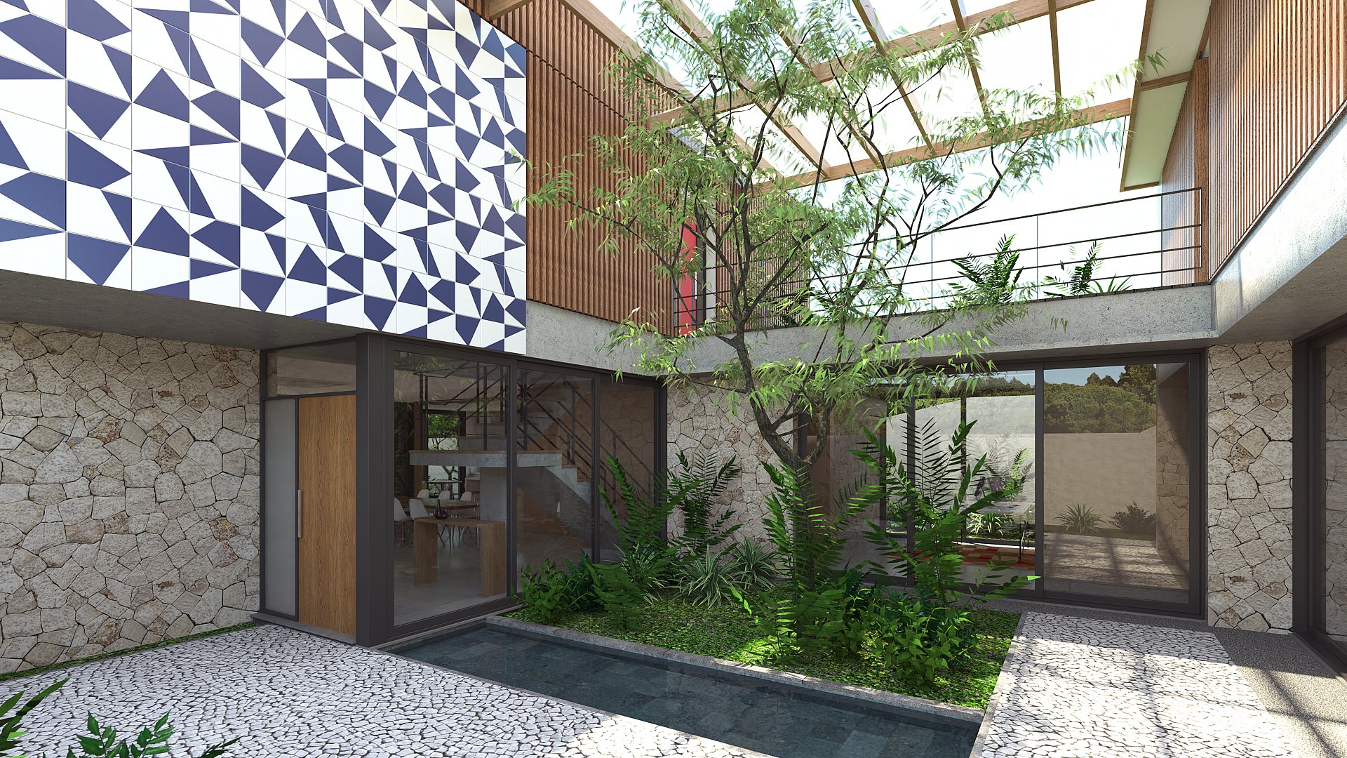 Casa em condomínio que prioriza a privacidade, integração e acolhimento familiar por meio de pátios e jardins. A implantação se acomoda com a topografia conformando o térreo em contato amplo com os jardins, pátio, áreas de convívio e lazer.