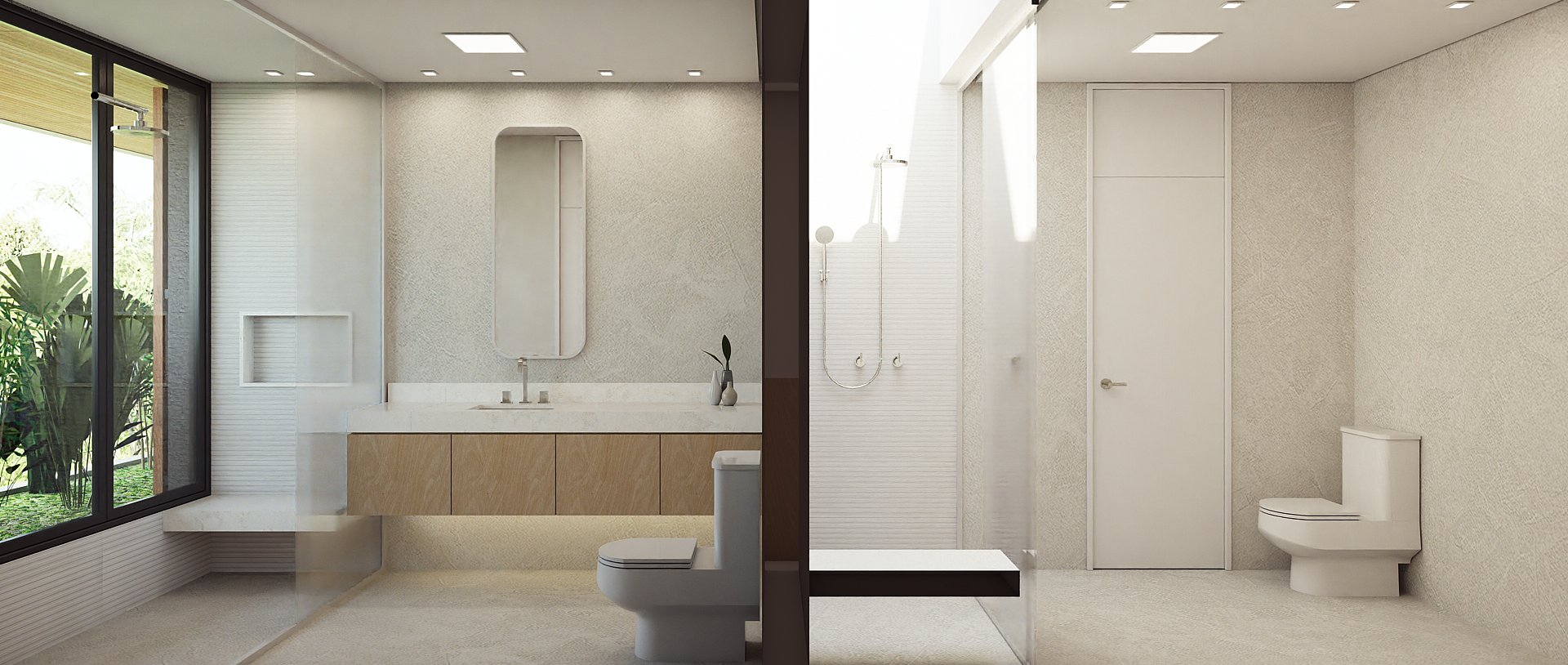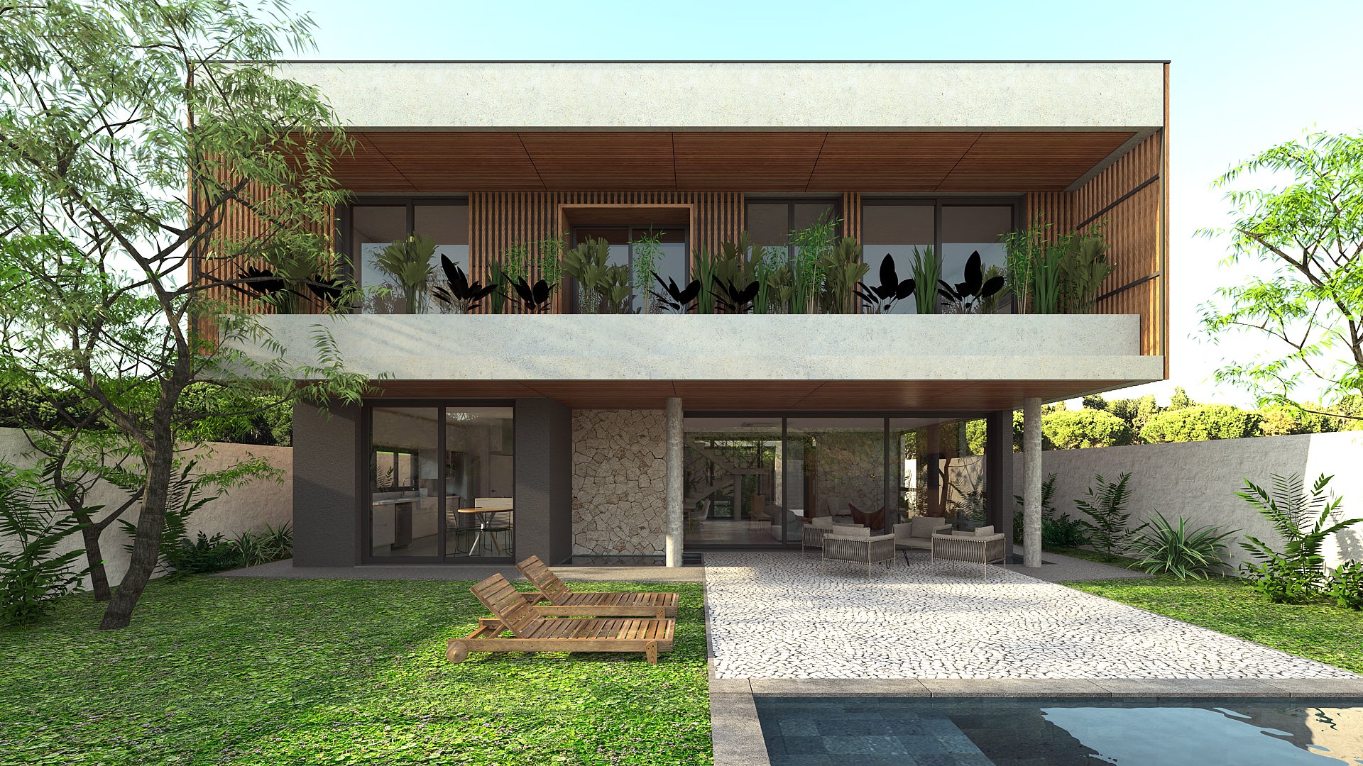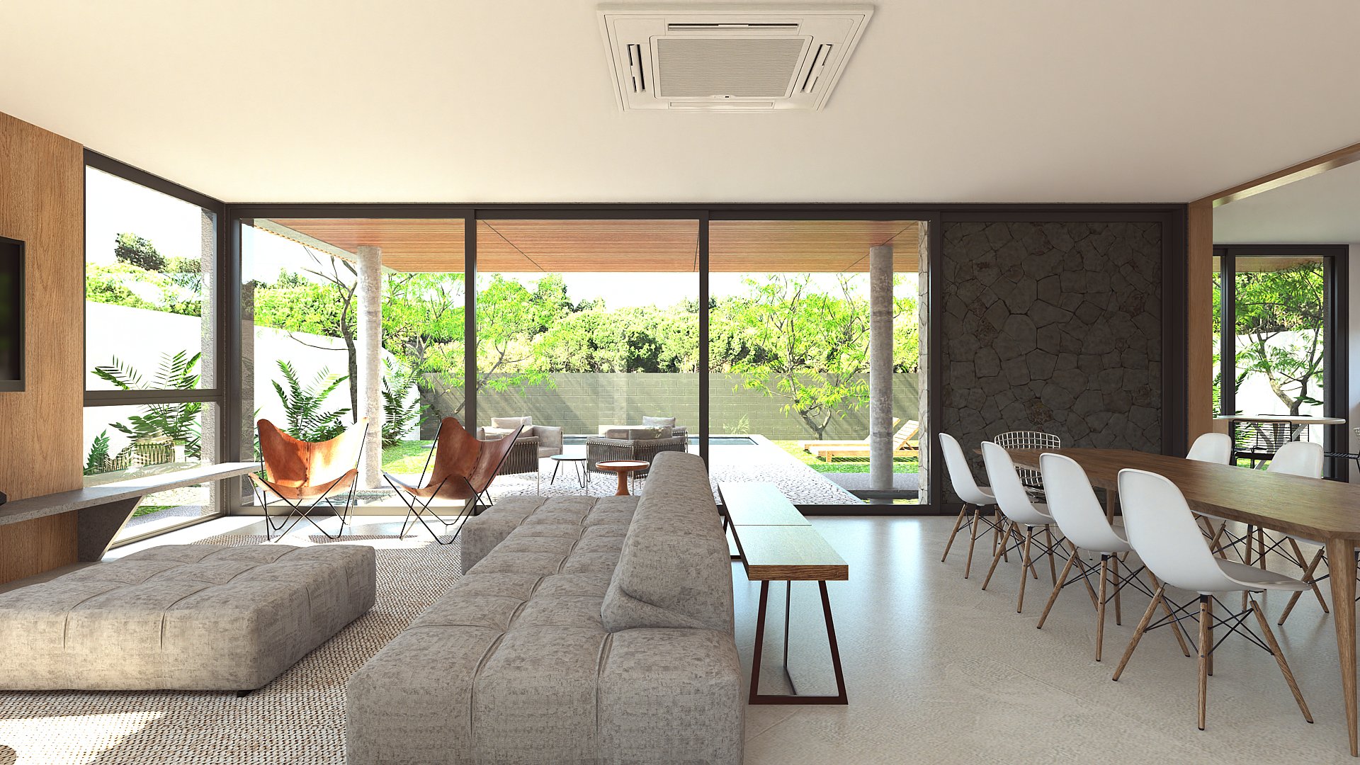 Casa em condomínio que prioriza a privacidade, integração e acolhimento familiar por meio de pátios e jardins. A implantação se acomoda com a topografia conformando o térreo em contato amplo com os jardins, pátio, áreas de convívio e lazer.